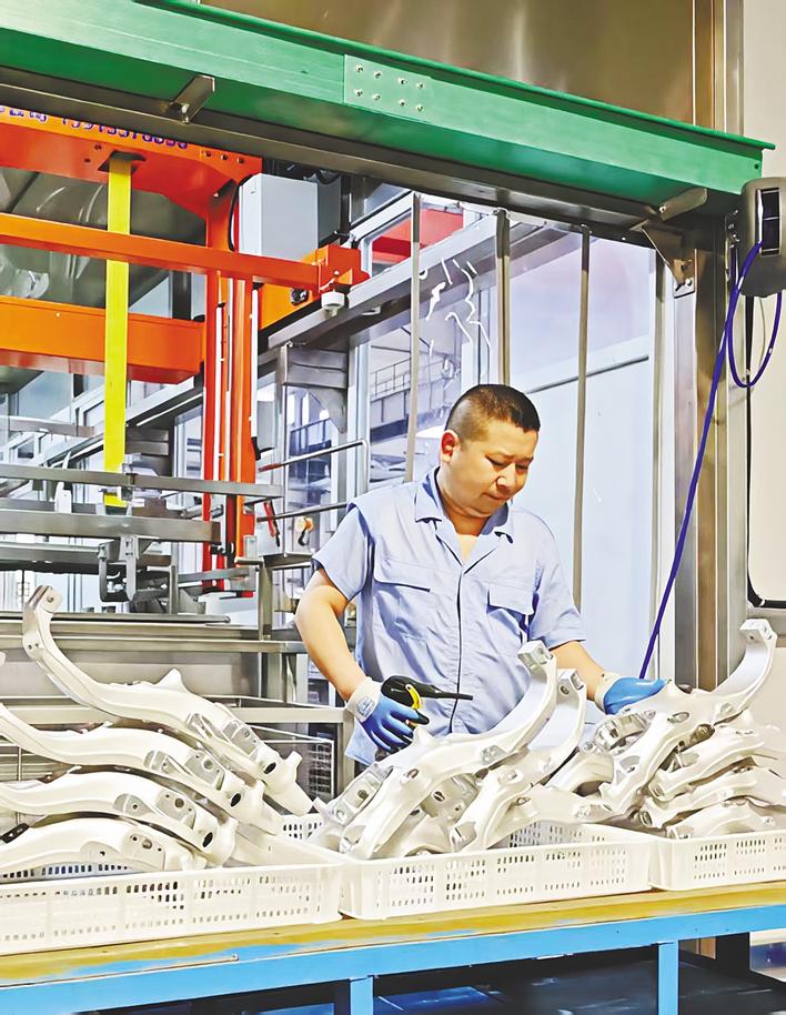 工作人员检查新能源乘用车转向节的整洁度。(受访单位供图)